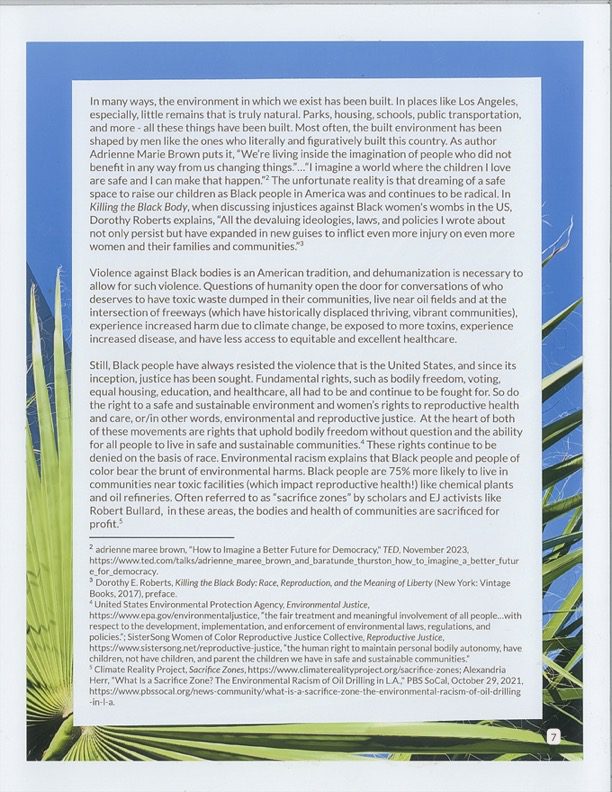 This zine explores the intersections between environmental and reproductive justice, by combining research with the stories, dreams, and recommendations for the future of Black women in Los Angeles. It is the culmination of Sophie Sylla’s nine-month long environmental justice fellowship with Black Women for Wellness.